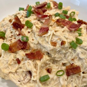 After the chicken is cooked, shred with 2 forks. Mix in cheddar cheese and cooked bacon and stir until cheese is melted and well incorporated. Top with green onions. Serve on buns, tortillas, or with veggies.